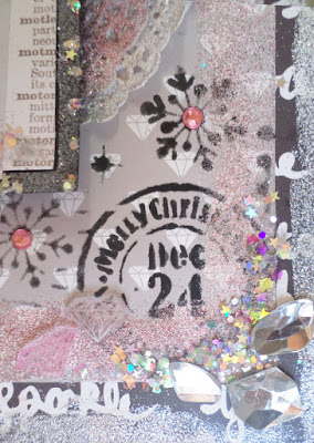 Then I used a black  ink and a Christmas stencil to create snowflakes. I added a pink gem in the centre for added bling.